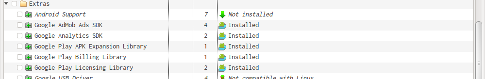 Extras - Google Play Licensing Library , Google Play APK Expansion Library 2개를 설치해줍니다.