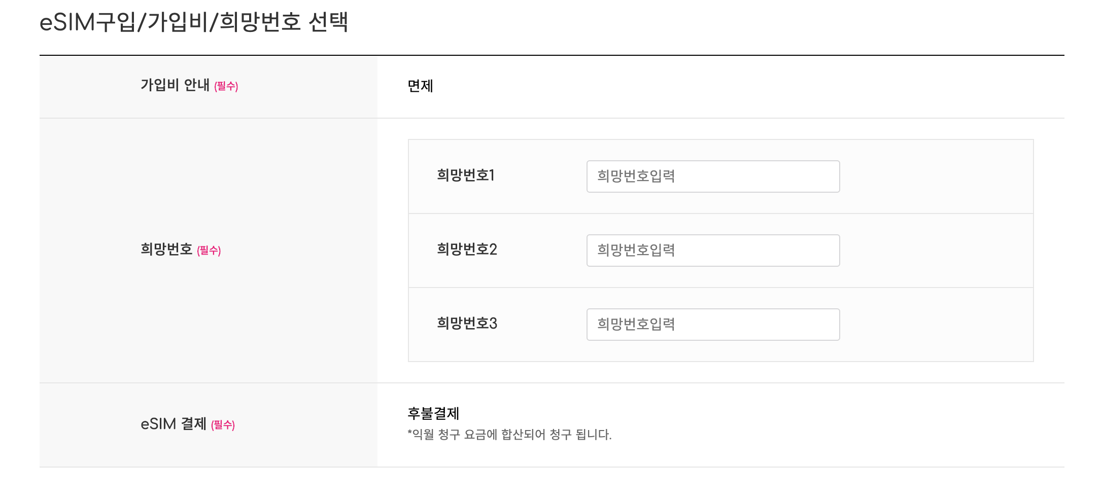 다이렉트몰에서 eSIM 신청을 하면 간단한 본인인증과 함께 일반적인 통신사가입과 동일한 정보를 입력합니다.